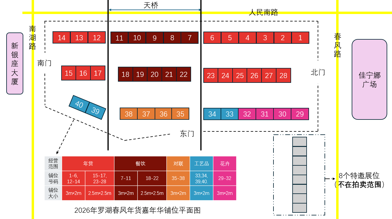 注:年货、餐饮最多可竞拍2个铺位,对联、工艺品及花卉不限竞拍铺位数量。